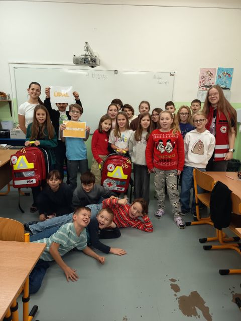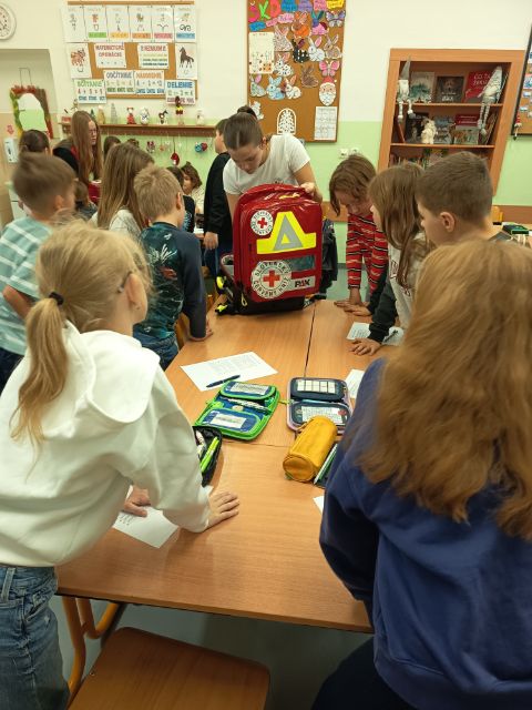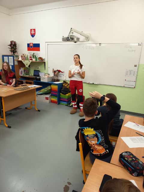 Zavítali k nám mladí dobrovoľníci z ČK, aby si spolu s deťmi precvičili modelové situácie, ktoré môžu nastať.