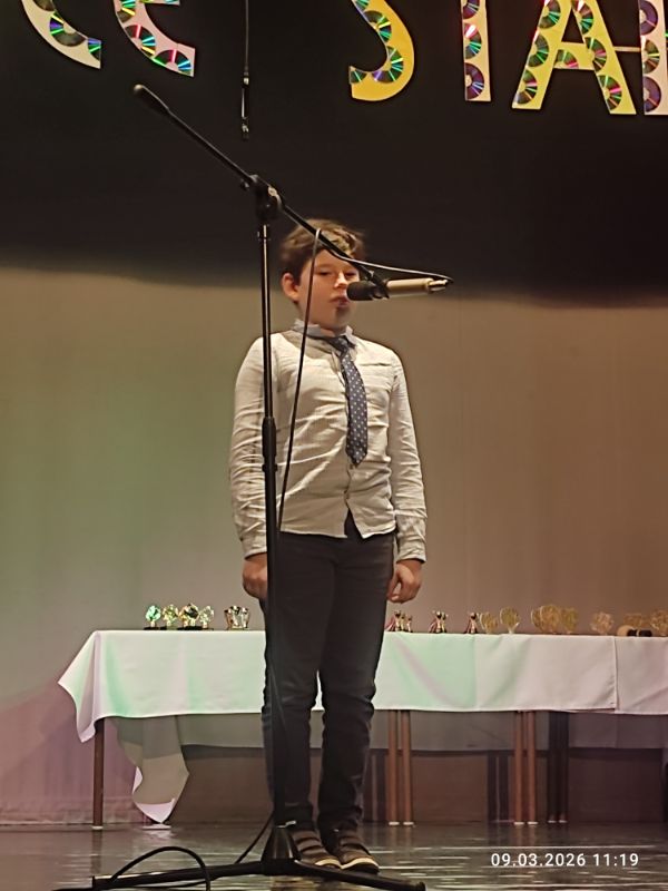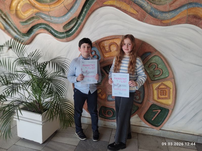 Dňa 9.3.2026 sa uskutočnila súťaž v speve populárnych piesní Košice Star. Našu školu zastupovali Stela Šalitrošová z 5.C a Gregor Henkrich z 3.M. Hoci sa v silnej konkurencii neumiestnili, podali pekný umelecký výkon a vzorne reprezentovali našu školu. Blahoželáme!