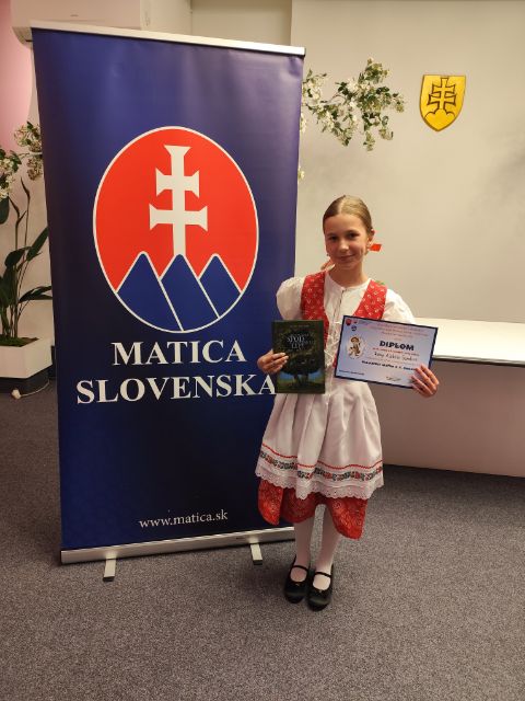 Žiačka našej základnej školy Ruby Alžbeta Gombos sa dňa 09.04.2026 zúčastnila krajského kola súťaže v prednese slovenskej povesti Šaliansky Maťko J. C. Hronského, kde sa umiestnila na krásnom 3. mieste. Srdečne jej gratulujeme.